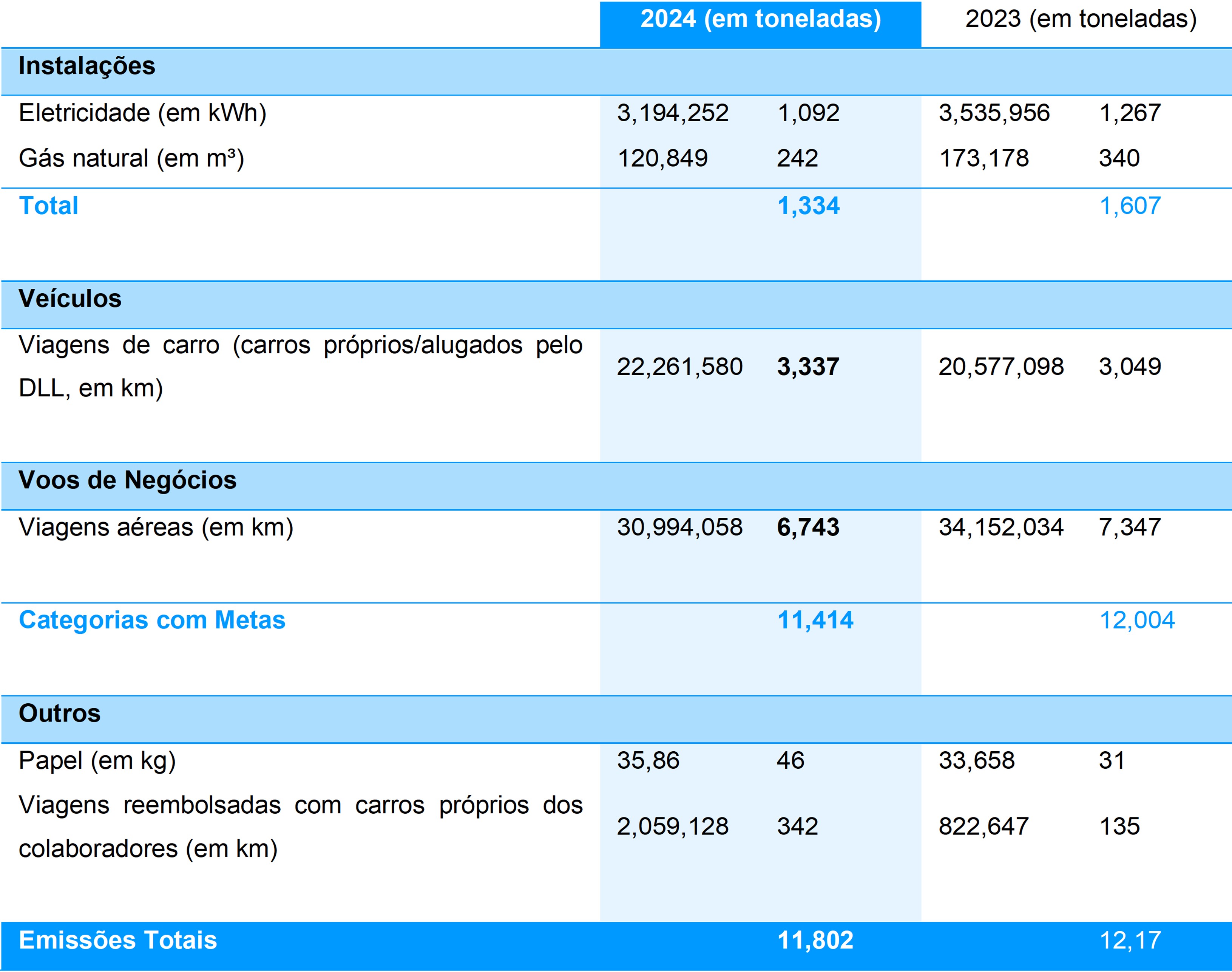 As emissões provenientes do uso de veículos – especificamente viagens de carro com veículos próprios ou alugados pelo DLL – aumentaram de 3,0 kt de CO₂ em 2023 para 3,3 kt de CO₂ em 2024 (Tabela 1). Esse aumento reflete tanto o crescimento dos negócios quanto a maior mobilidade após o relaxamento das restrições de viagem relacionadas à pandemia.