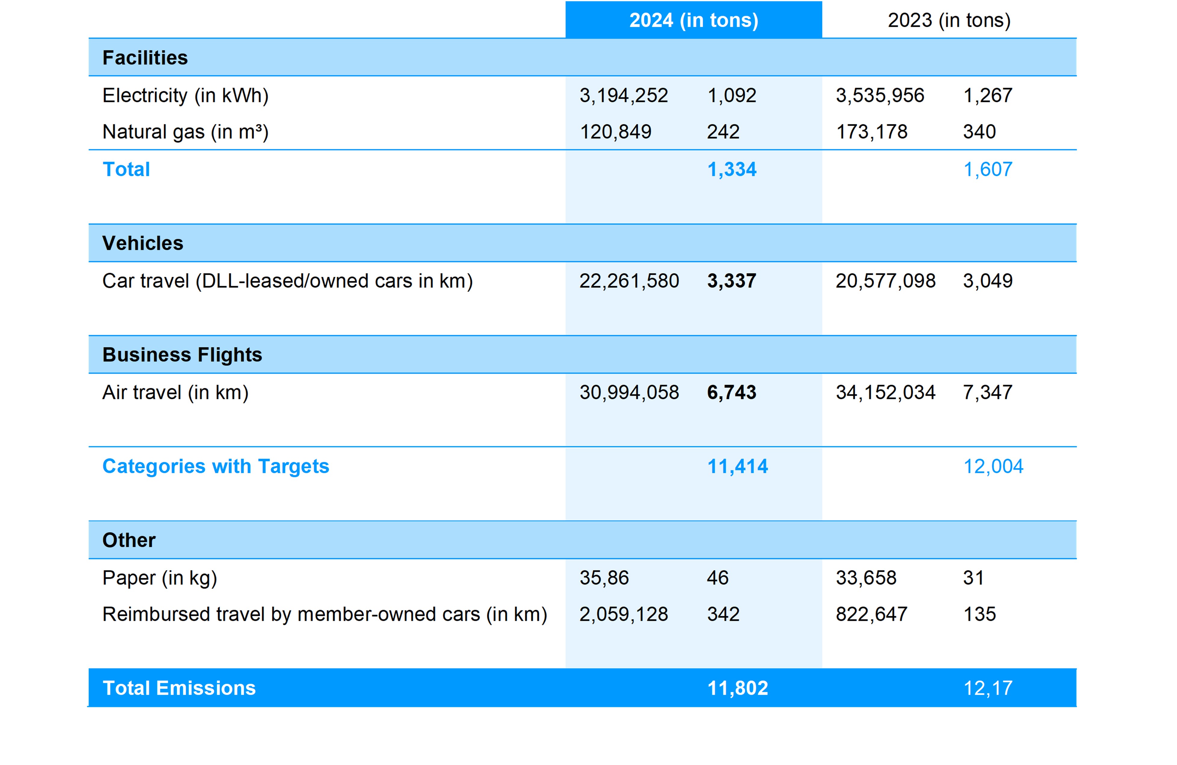 Emissions from vehicle use – specifically car travel through DLL-leased or owned vehicles – rose from 3.0 kt CO₂ in 2023 to 3.3 kt CO₂ in 2024 (Table 1). This increase reflects both business growth and greater mobility following the easing of pandemic-related travel restrictions.
