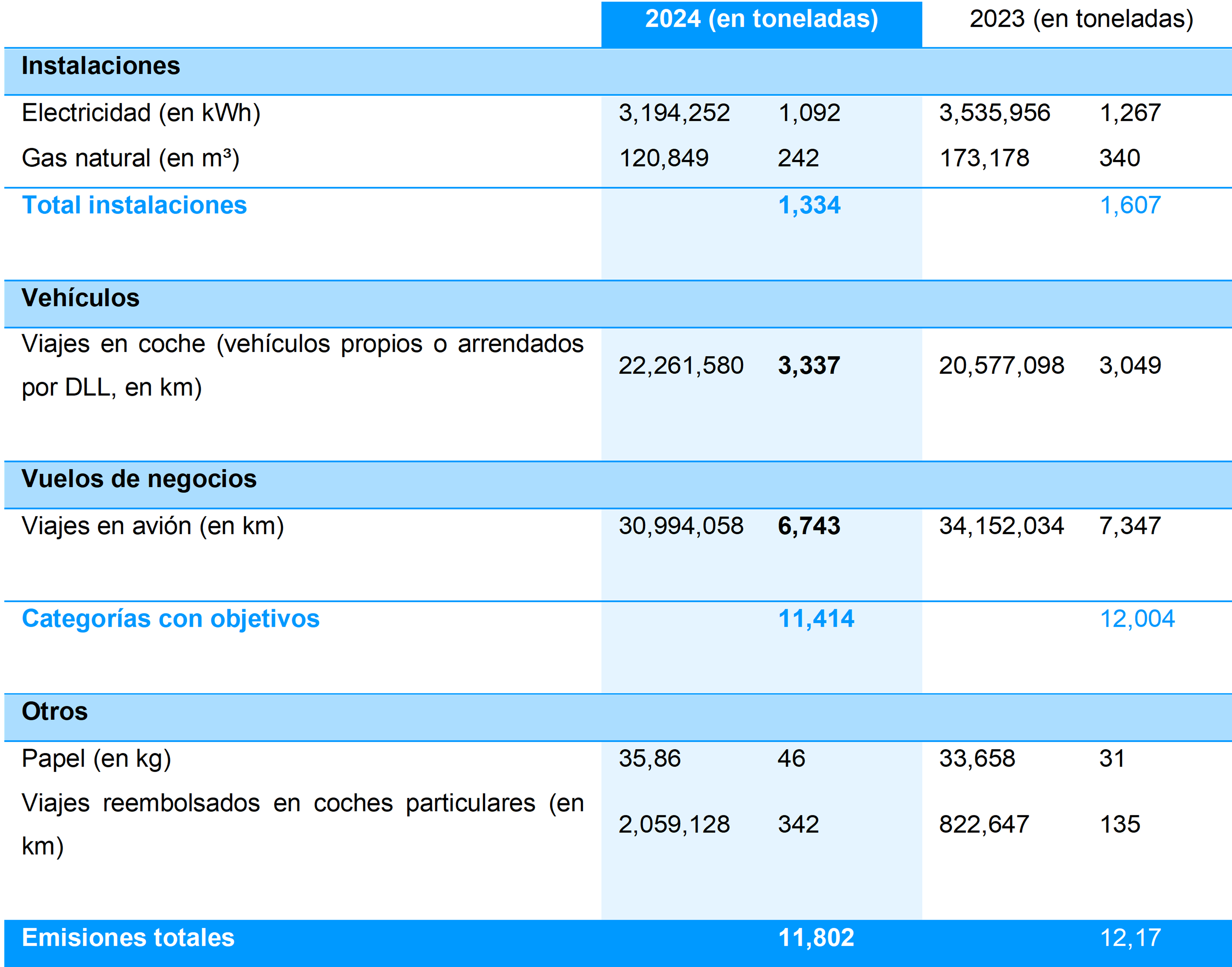 Las emisiones operativas restantes provienen principalmente del uso de papel y de los desplazamientos en coche reembolsados. Aunque actualmente no están incluidas en nuestros objetivos de reducción operativa, estas fuentes se supervisan activamente y se informan como parte de nuestra huella ambiental más amplia en el informe anual, en la página 22. En 2024, las emisiones de estas categorías aumentaron de 0,2 kt de CO₂ en 2023 a 0,4 kt de CO₂ (Tabla 1), lo que refleja un retorno parcial a los niveles de actividad previos a la pandemia. Con la reanudación de las visitas a oficinas y clientes, aumentaron los desplazamientos relacionados y el consumo de papel. Se espera que esta tendencia se estabilice, y DLL podría considerar incluir estas fuentes en futuros objetivos de reducción como parte de su compromiso continuo con el desempeño ambiental.