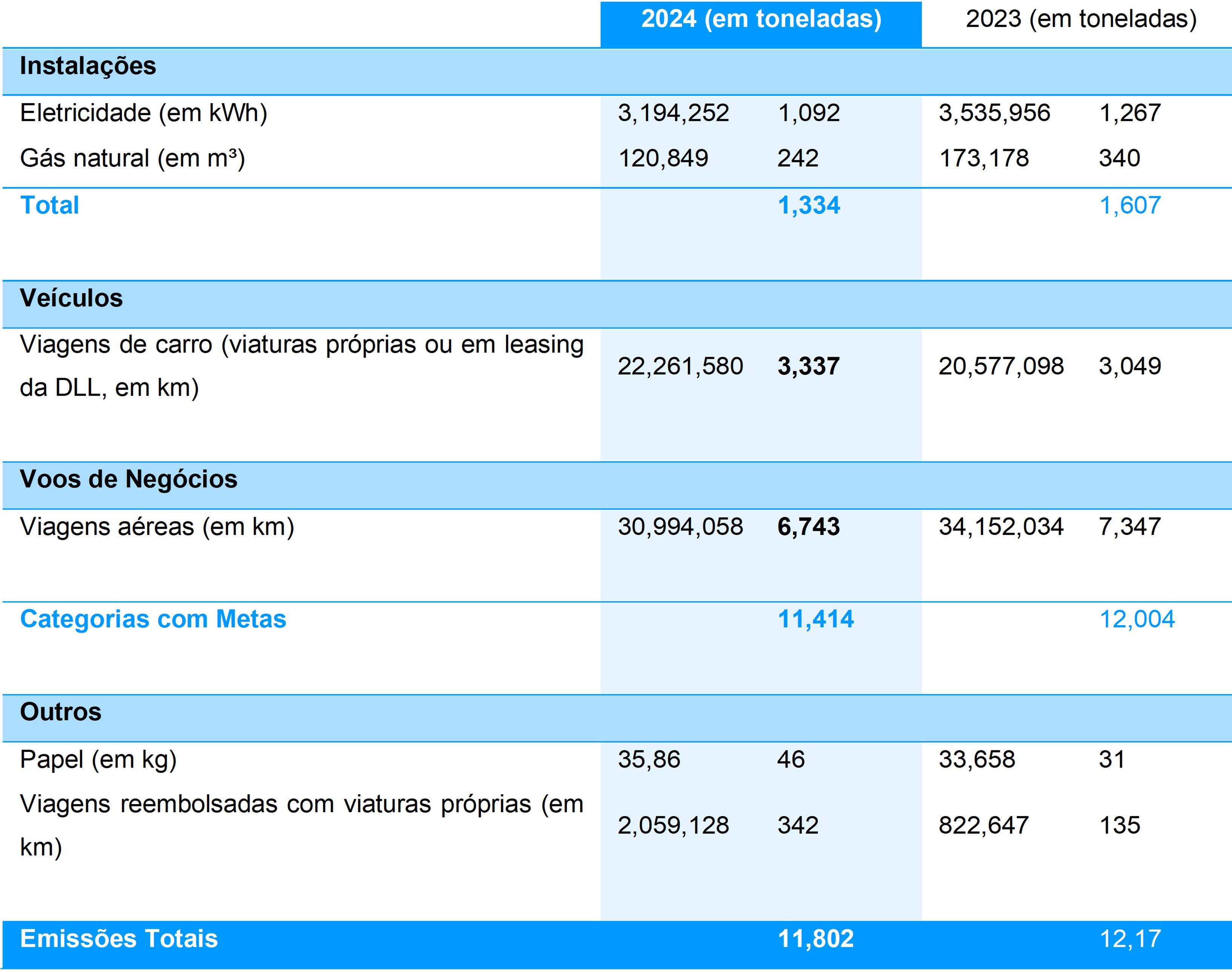 As emissões provenientes de viagens aéreas diminuíram de 7,3 kt CO₂ em 2023 para 6,7 kt CO₂ em 2024 (Tabela 1), refletindo uma mudança positiva nas práticas de viagem da DLL.